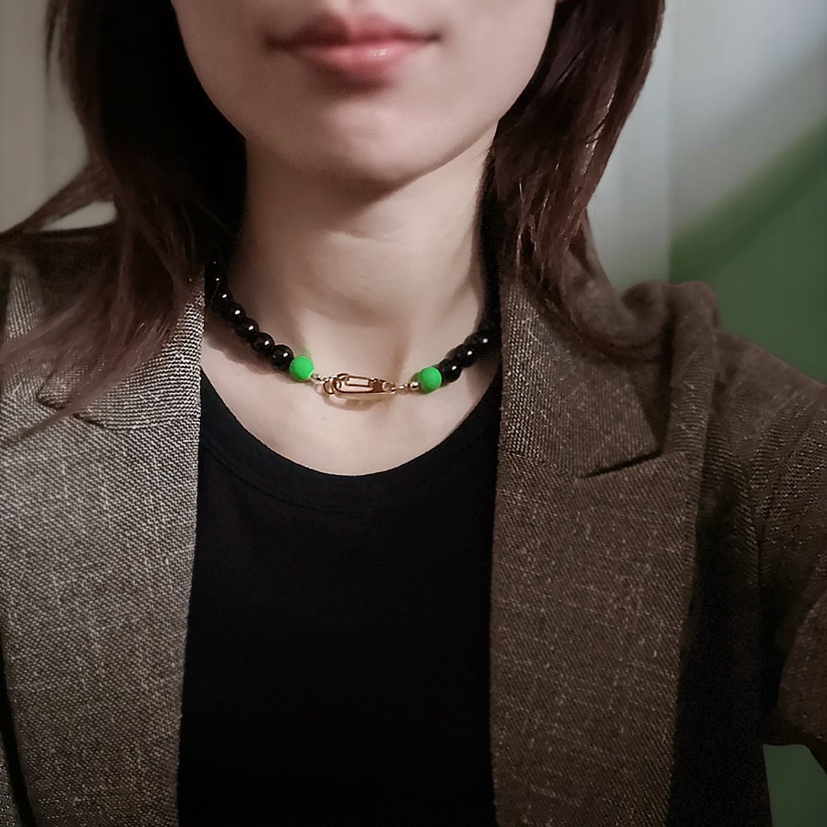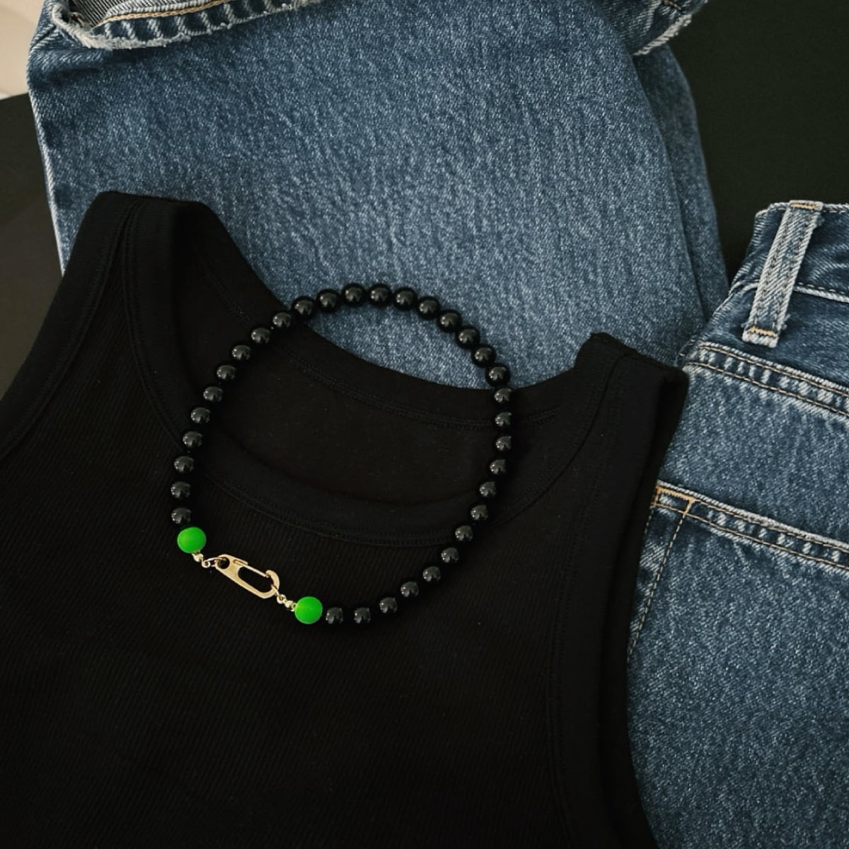 黒に馴染みながらも、さりげなく存在感を放つネオングリーン。