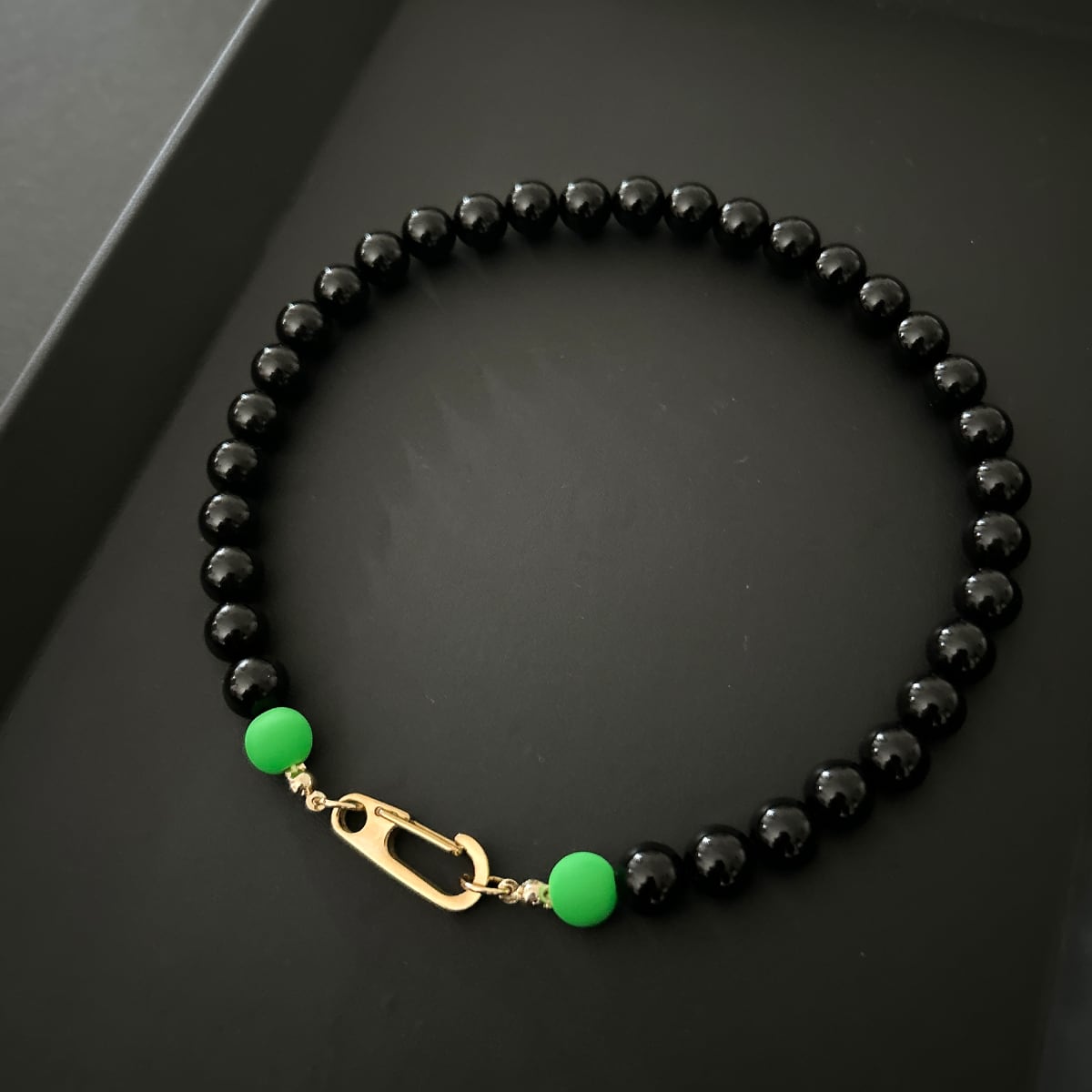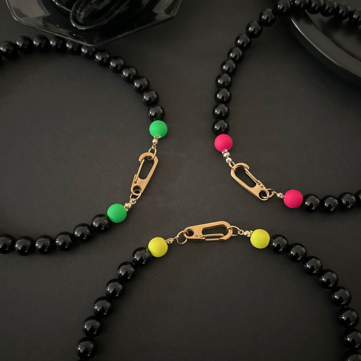 オニキスの隙間からチラッと覗くネオンカラーの紐が、さりげない可愛さ。