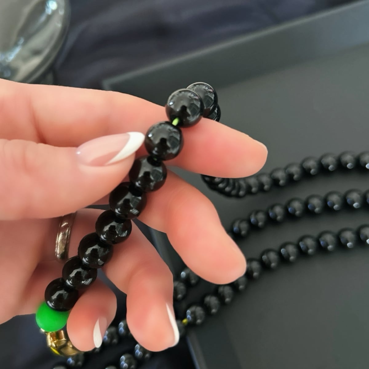 天然石ならではの深みのある黒が、どんなコーデにも馴染みます。