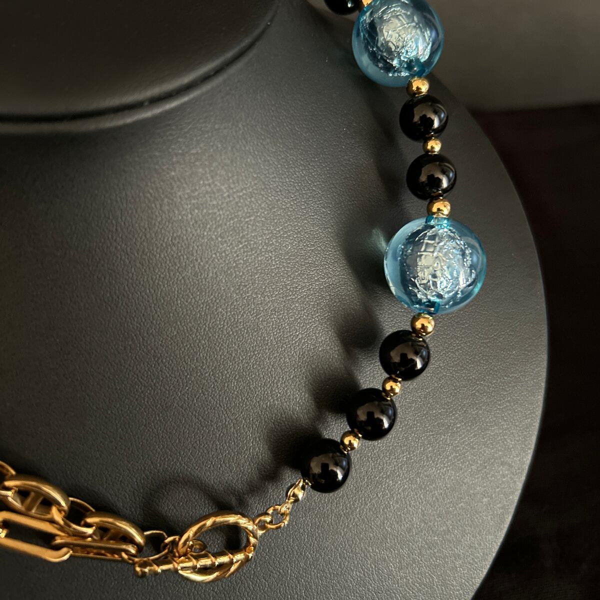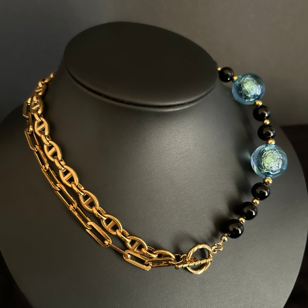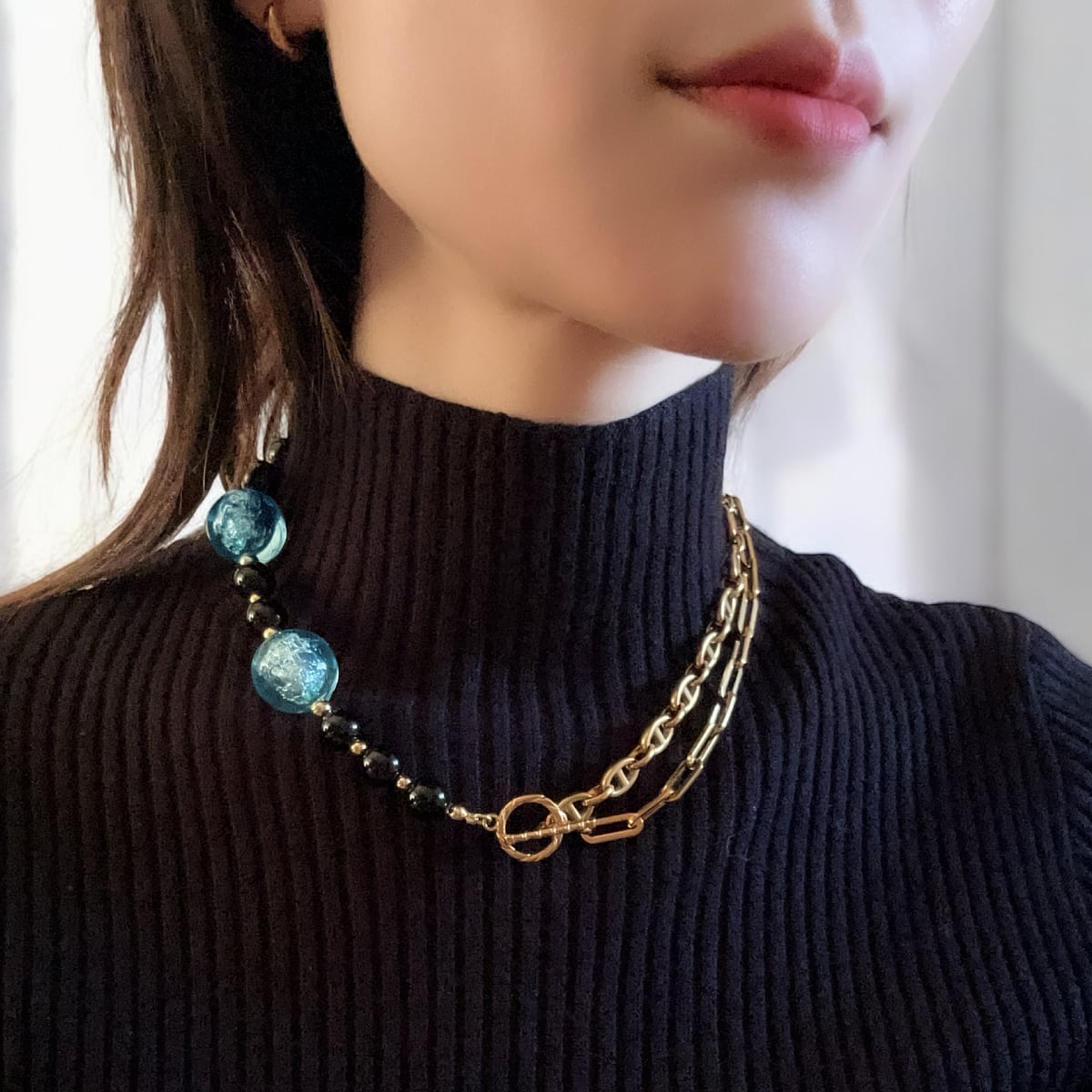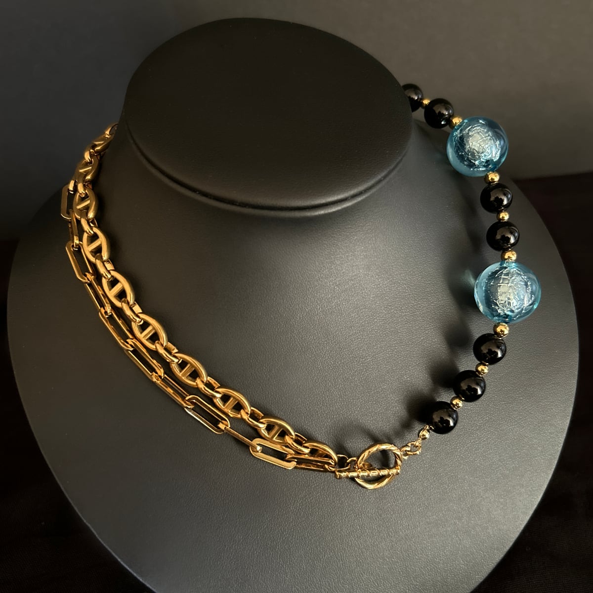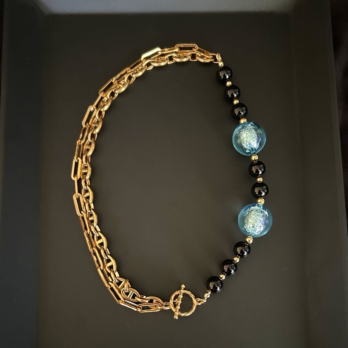 ゴールドチェーン、ブラックオニキス、そして箔入りカラービーズ——