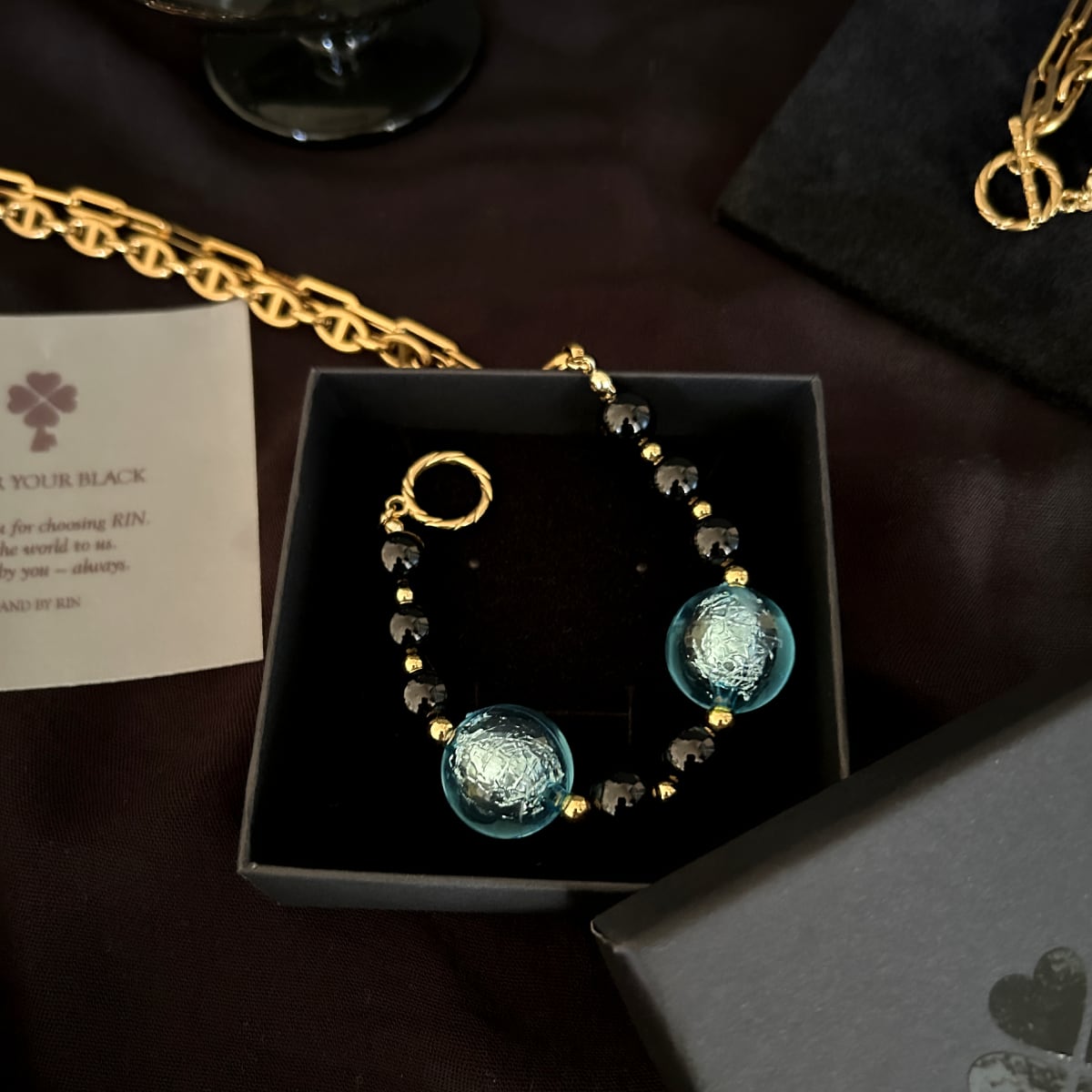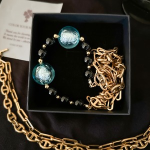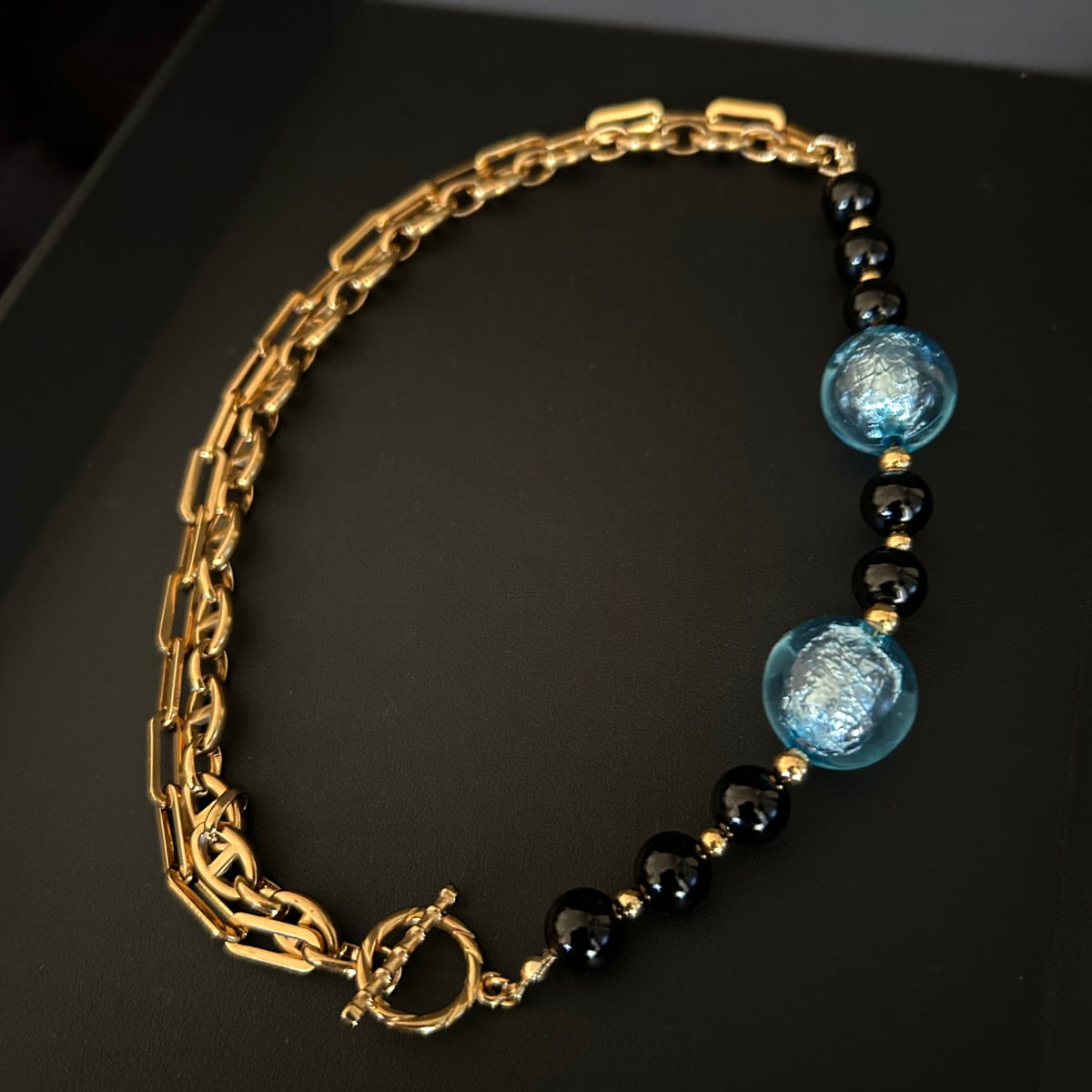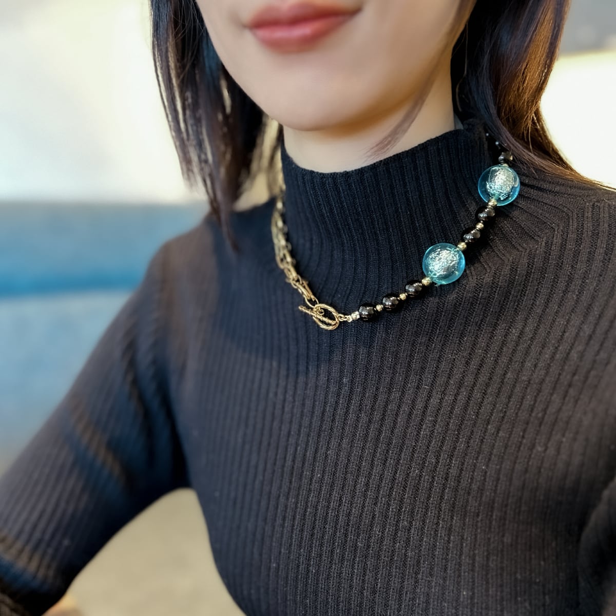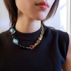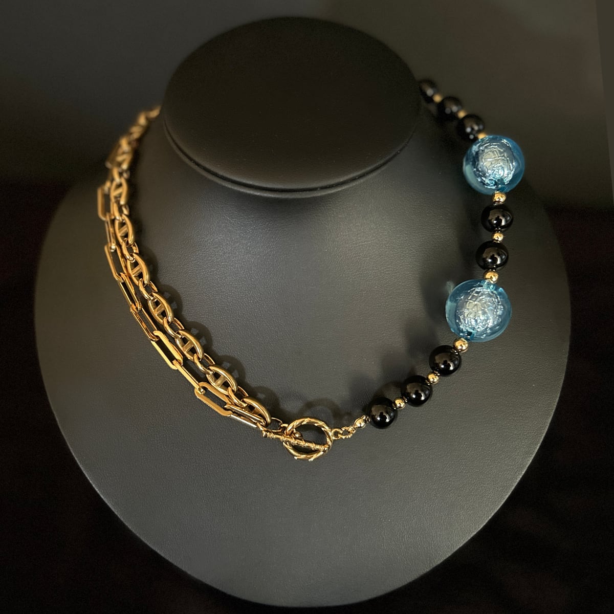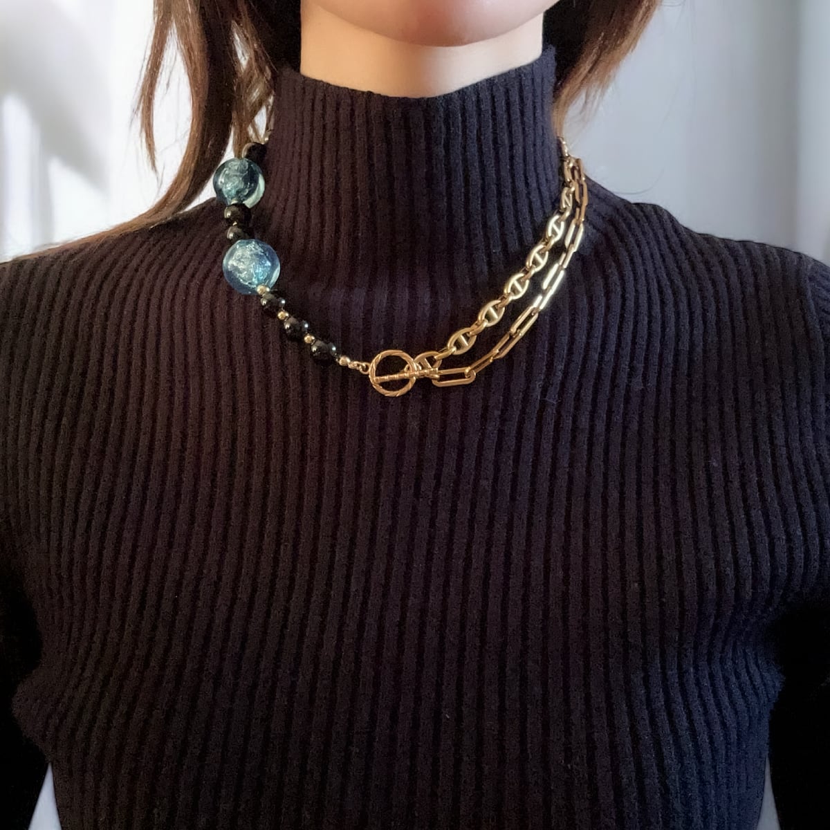 ゴールドチェーン、ブラックオニキス、そして箔入りカラービーズ——