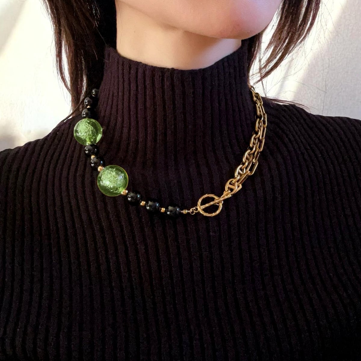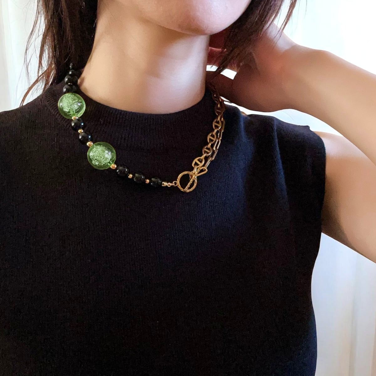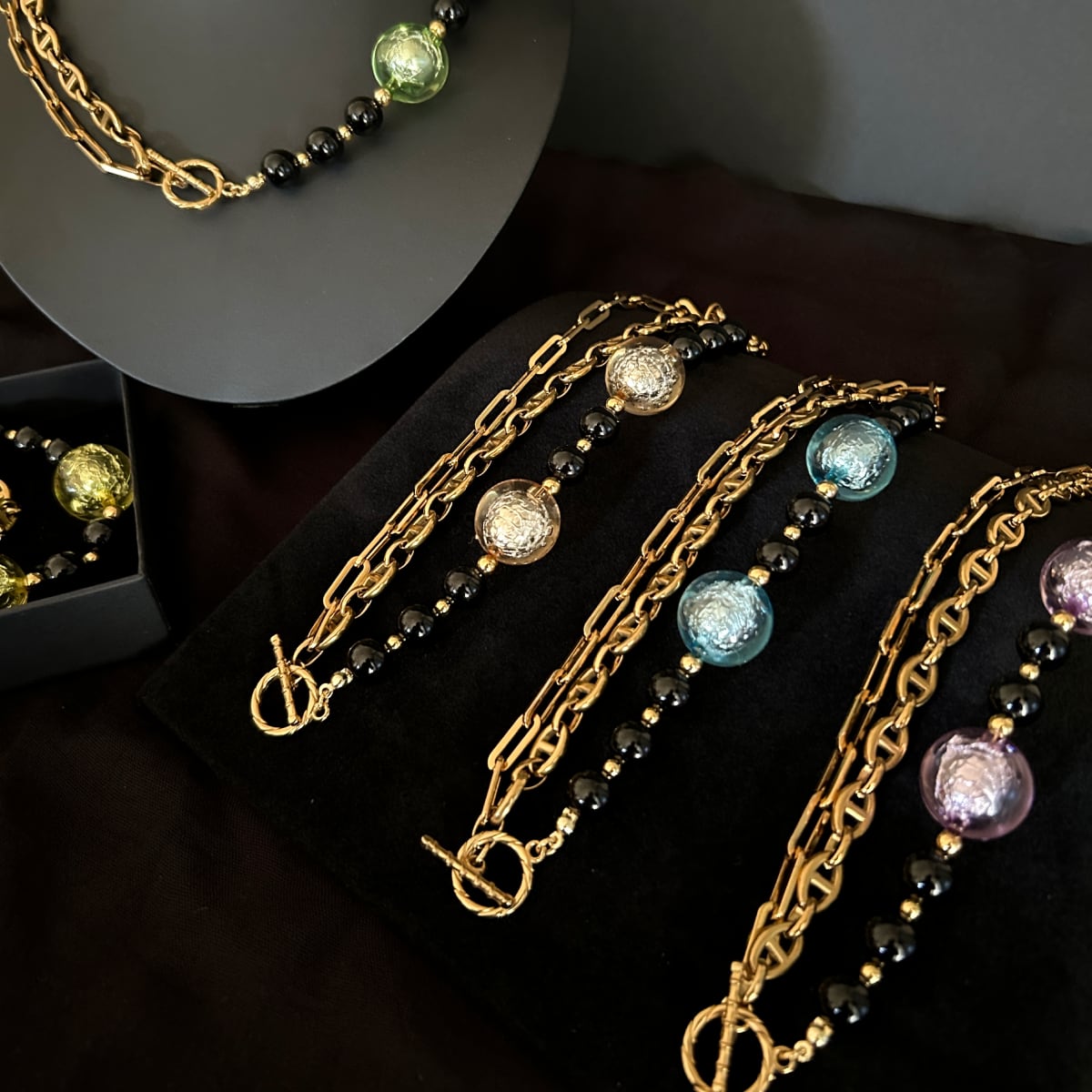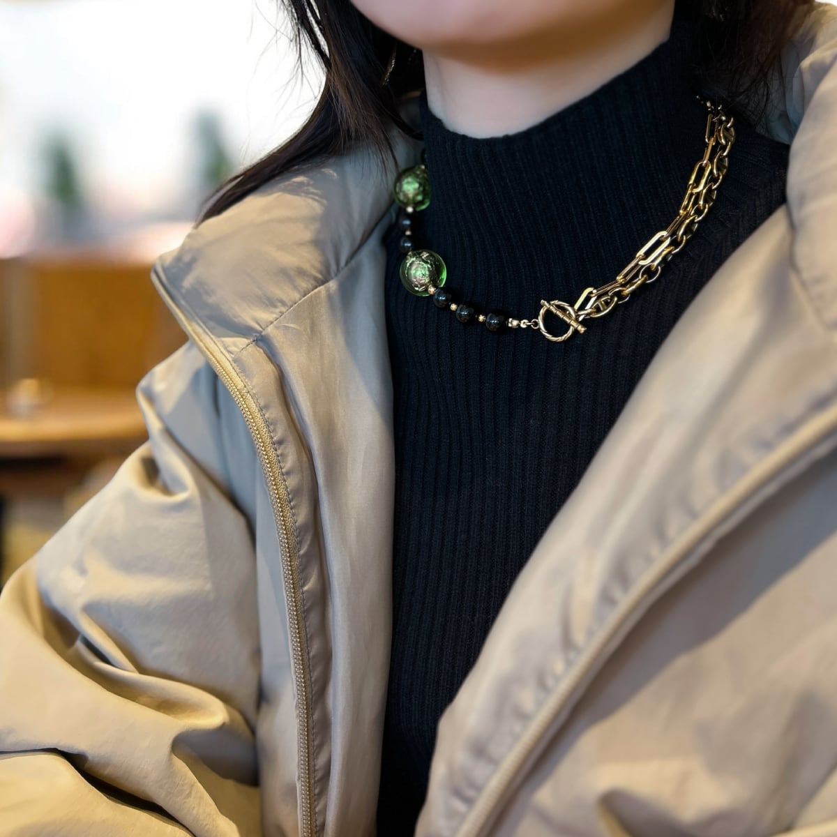 ゴールドチェーン、ブラックオニキス、そして箔入りカラービーズ——