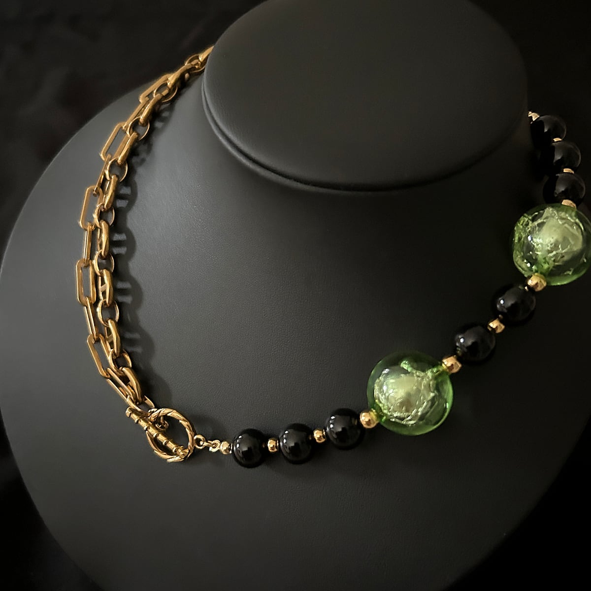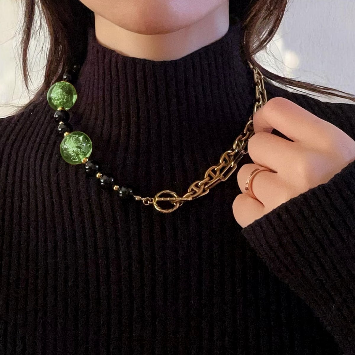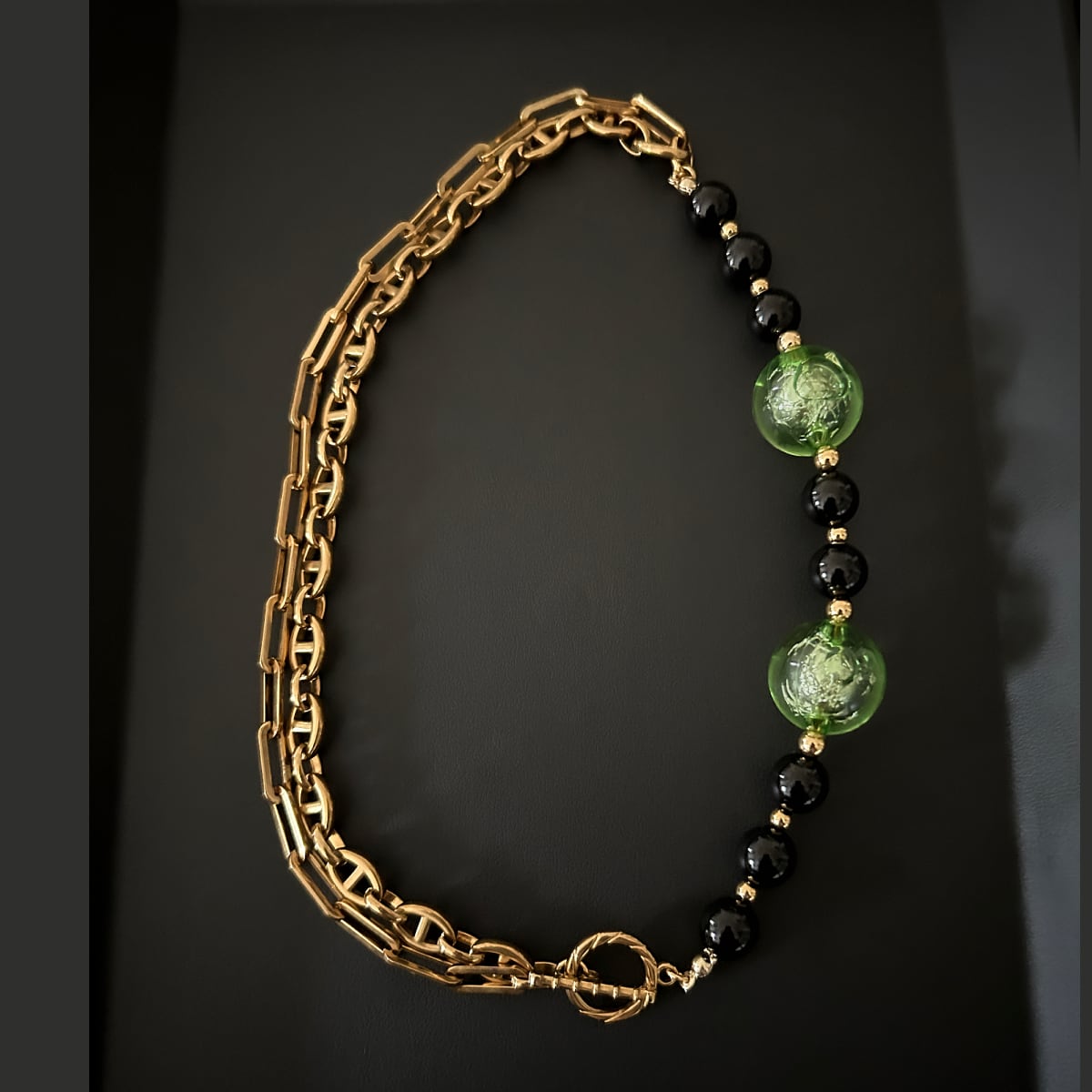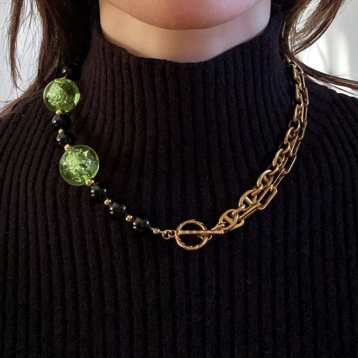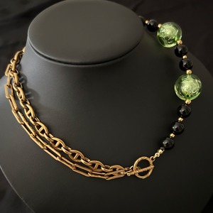 ゴールドチェーン、ブラックオニキス、そして箔入りカラービーズ——
