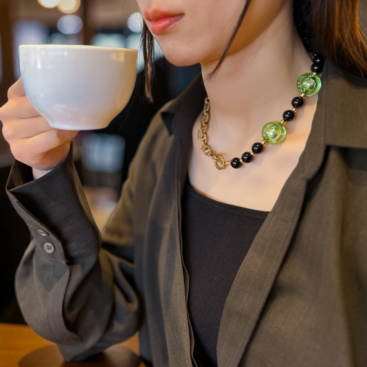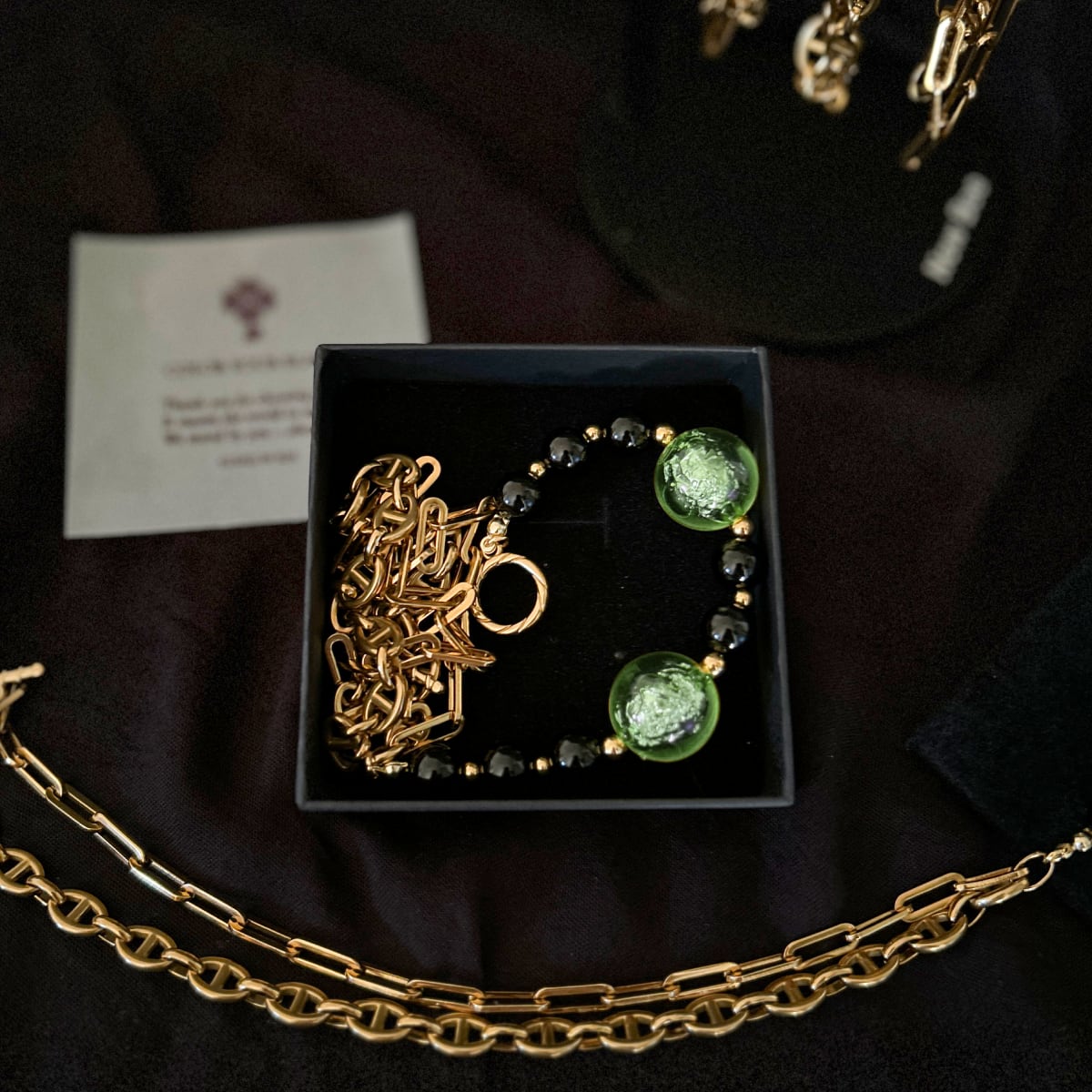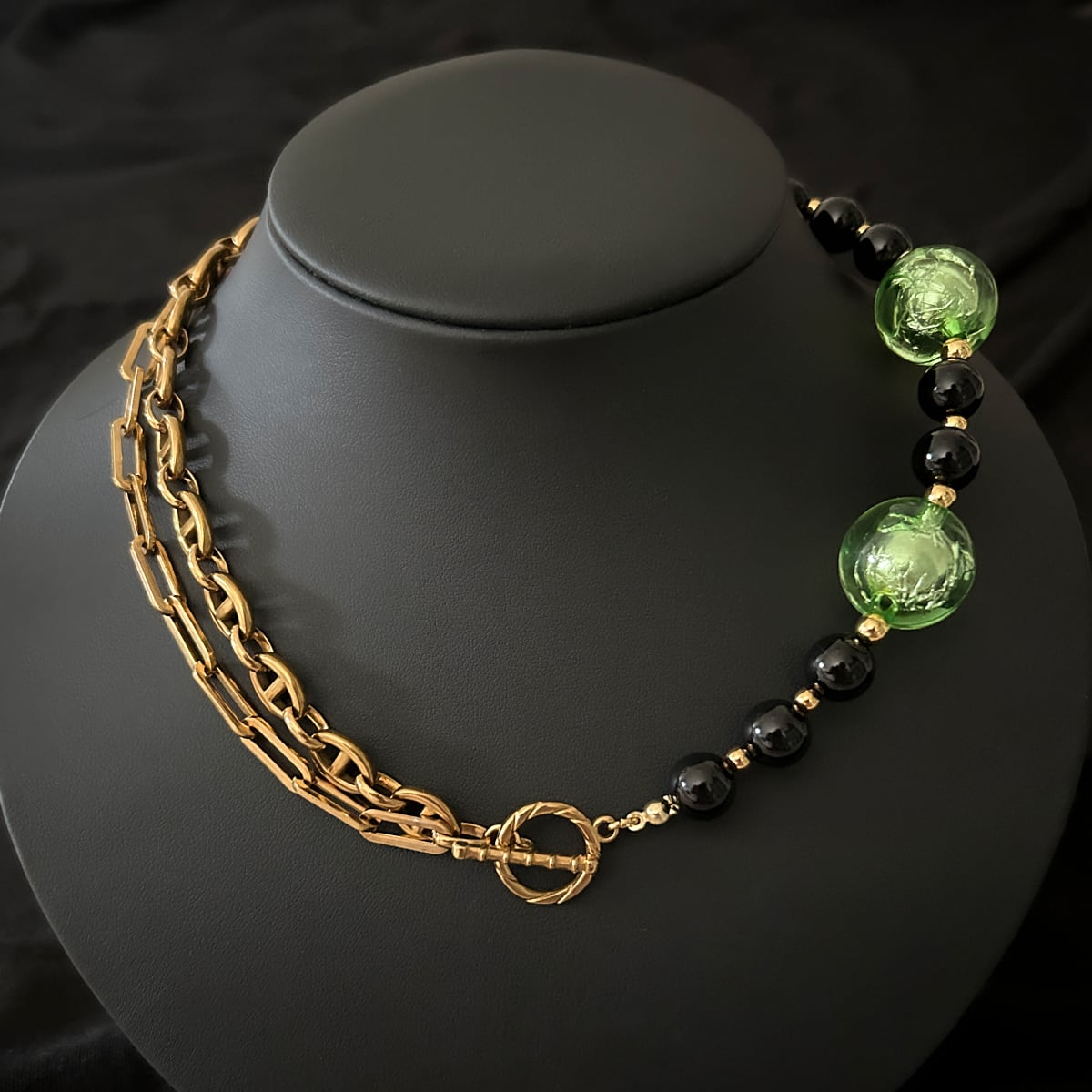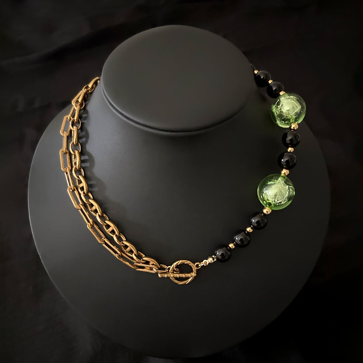 ゴールドチェーン、ブラックオニキス、そして箔入りカラービーズ——