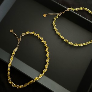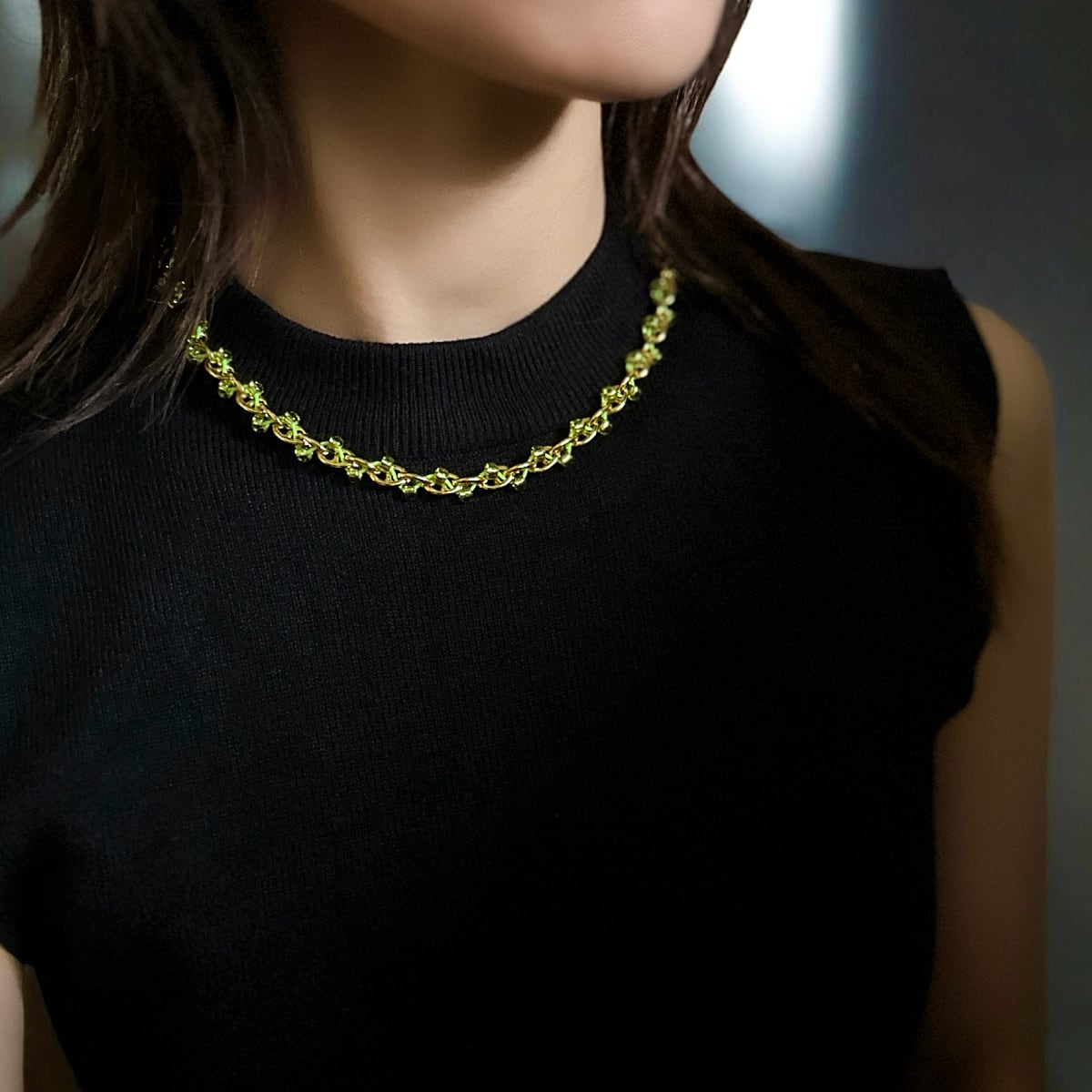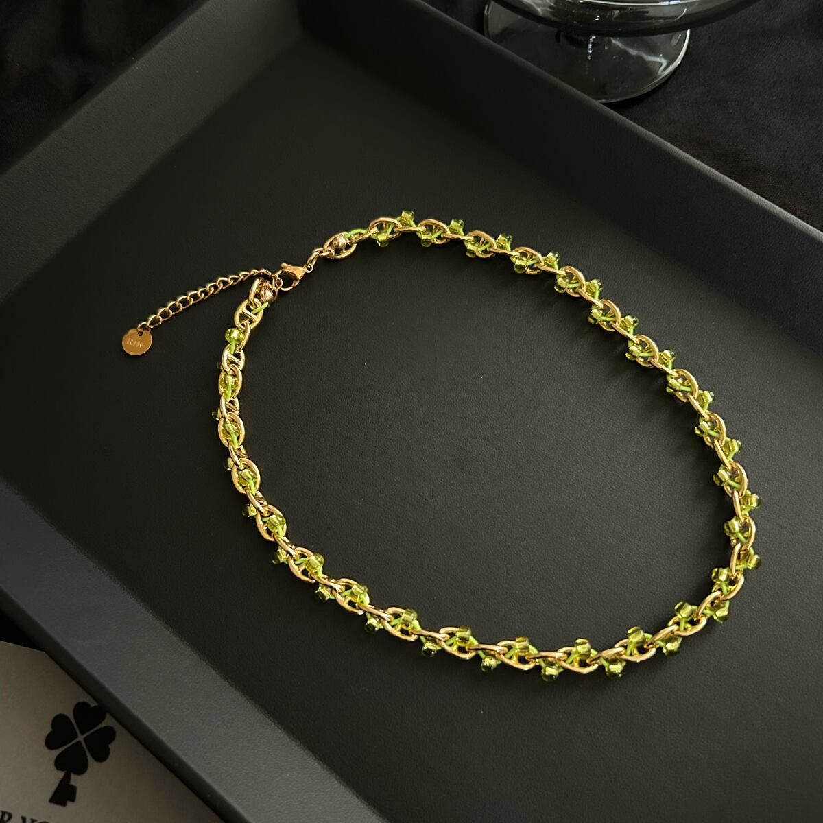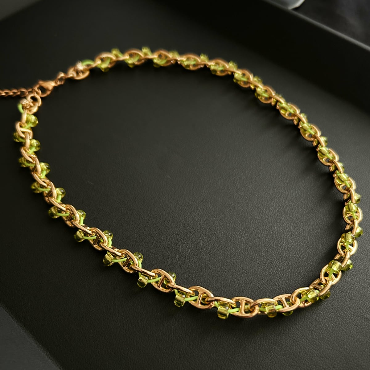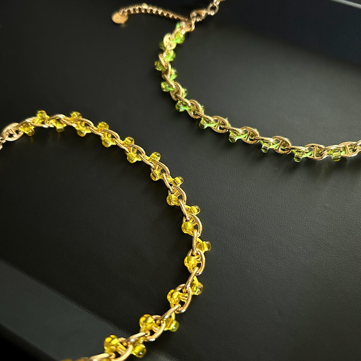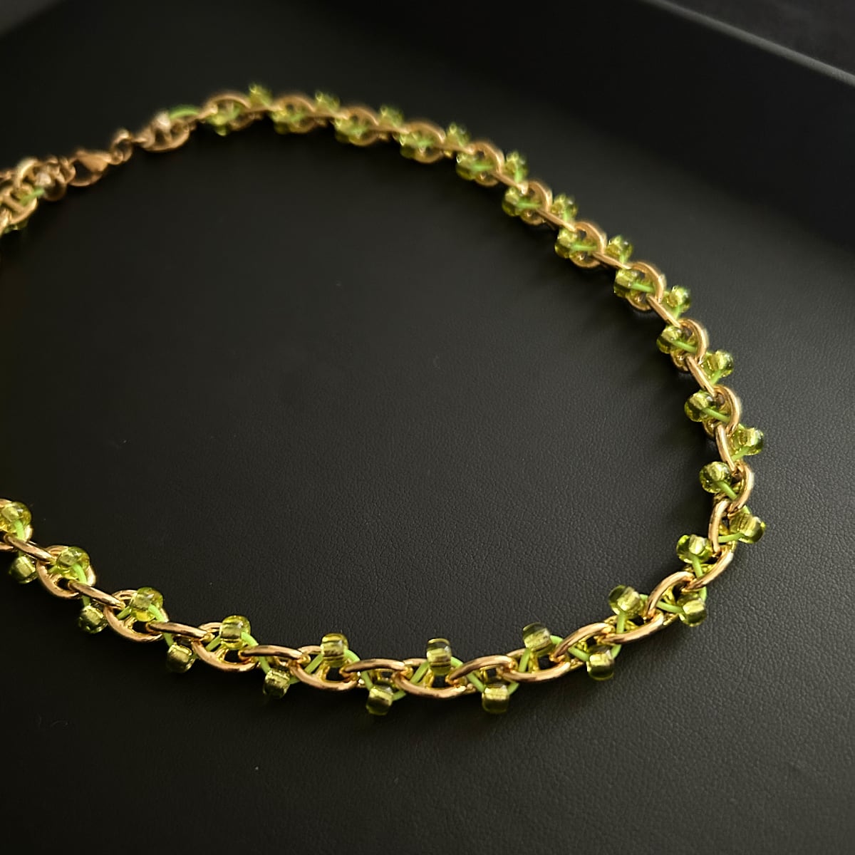 ゴールドのチェーンに、グリーンの銀引きビーズがひとつひとつ丁寧に絡みつく。規則的なのに、表情がある。チェーンネックレスとは思えない、柔らかさ。