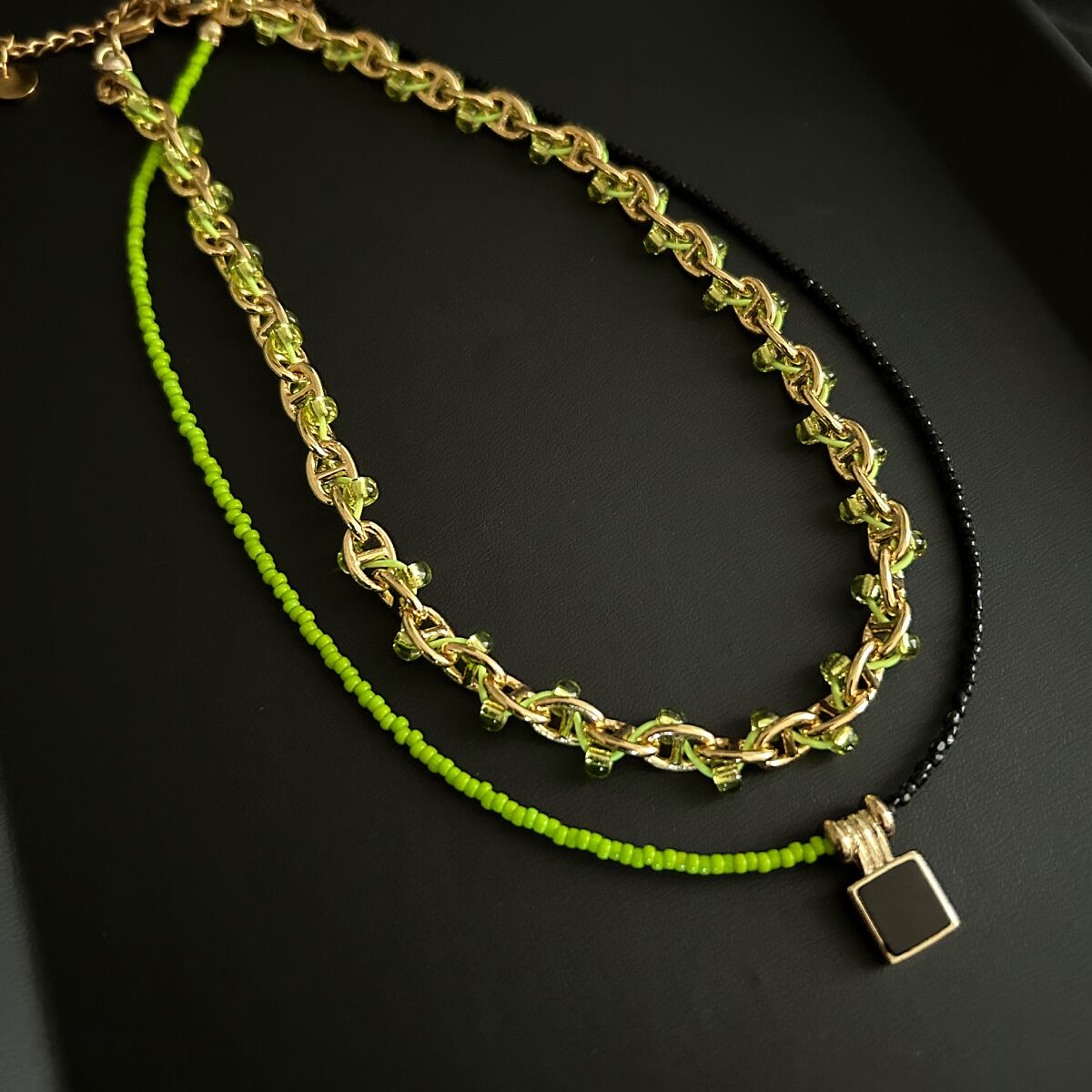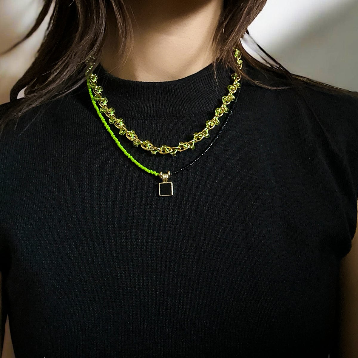 一本でも華やか。お手持ちのゴールドネックレスと重ねれば、さらに表情が増す。TWO FACEと合わせると、黒×グリーンのコントラストがさらに際立つ。