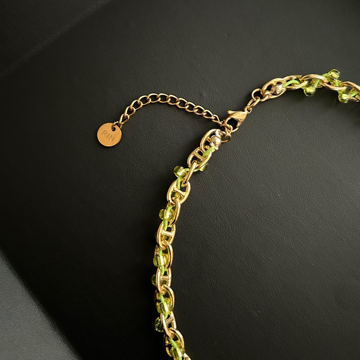 素材:アンカーチェーン真鍮18kgp / グリーンビーズ銀引き2mm / 金具アジャスターカニカンサージカルステンレス(ゴールドメッキ)